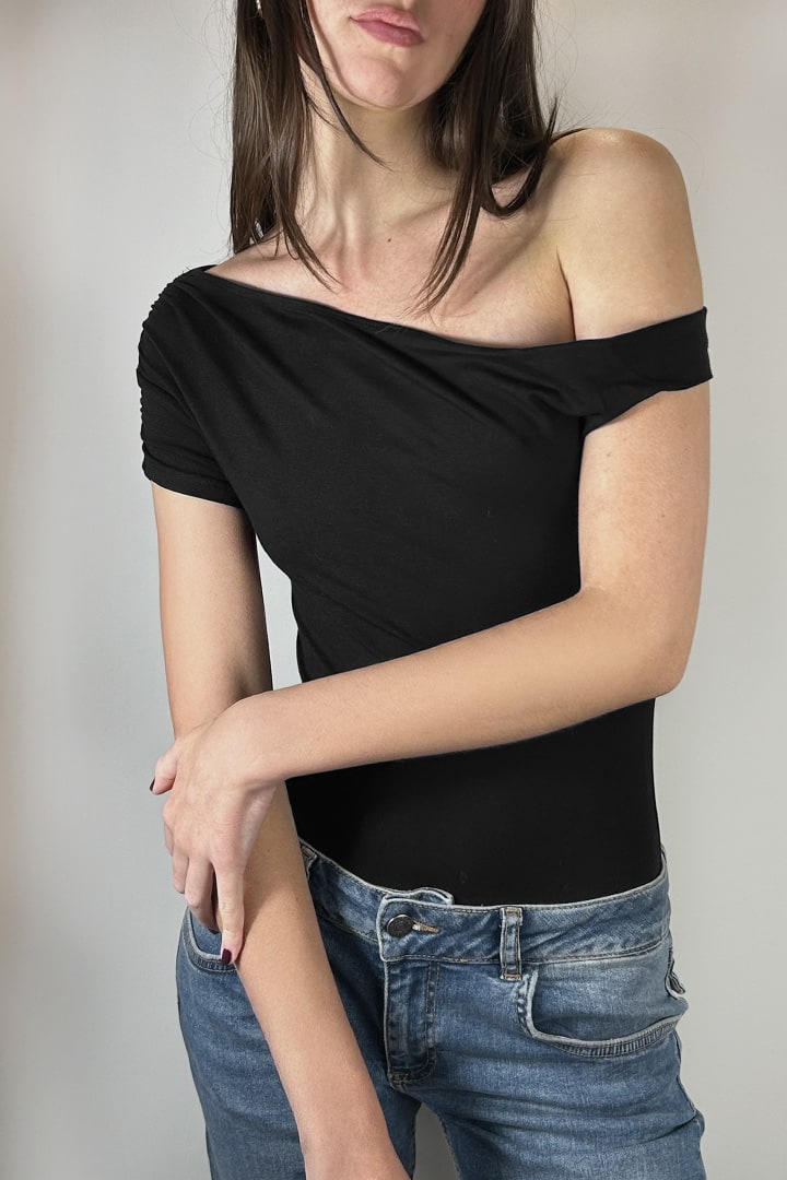 Asymmetric neckline bodysuit, short sleeves, regular length, slim fit.