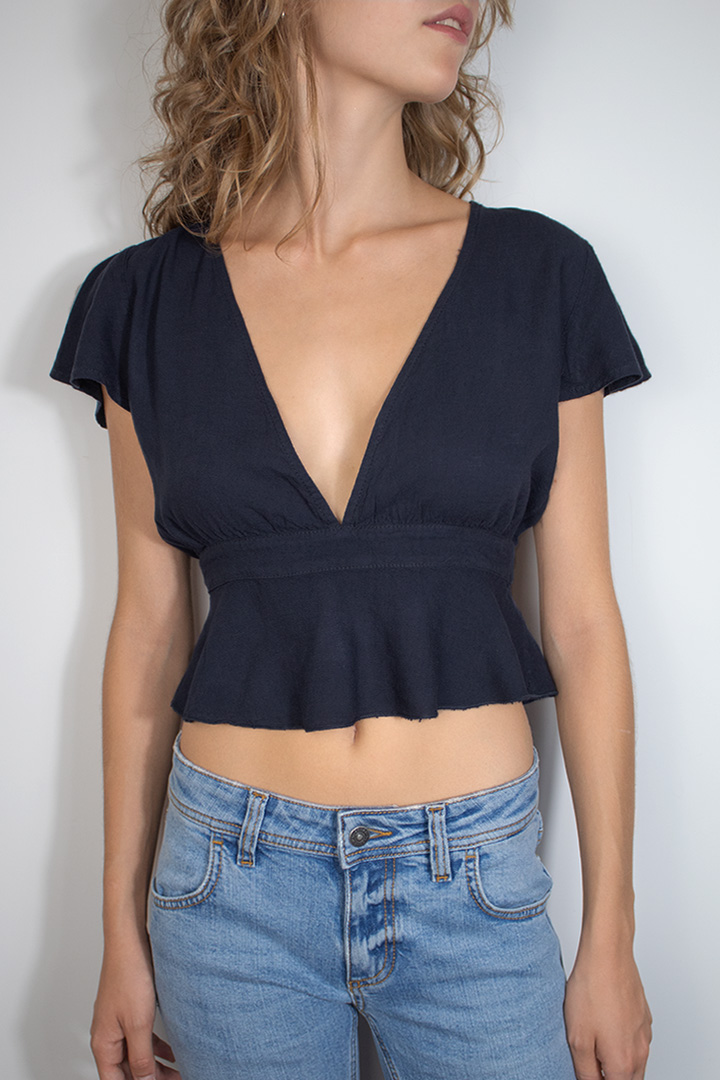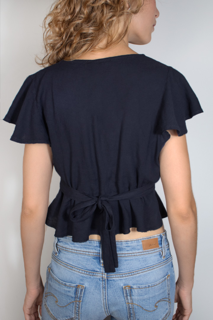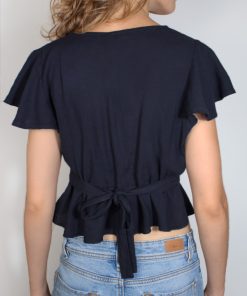 Blouse with bow back, front v neckline, short sleeves, short length, relaxed fit.