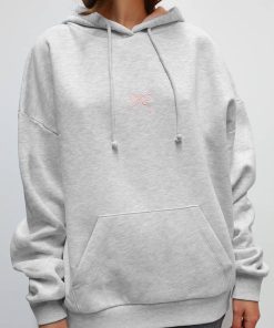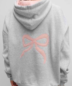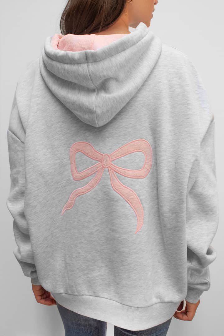 Bow hoodie with lace, hood with inner lace, front pockets, long sleeves, long length, relaxed fit.