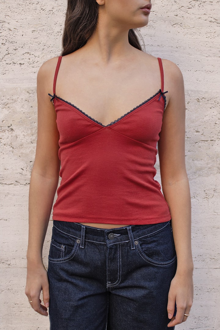 V-neck top, bow detail, sleeveless, short length, slim fit.