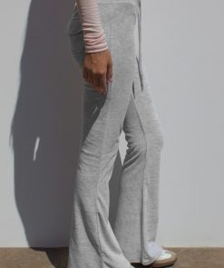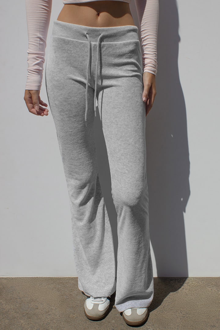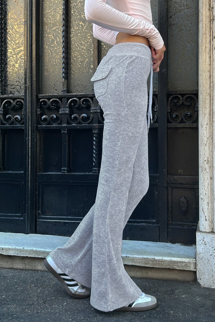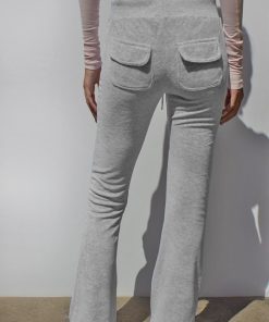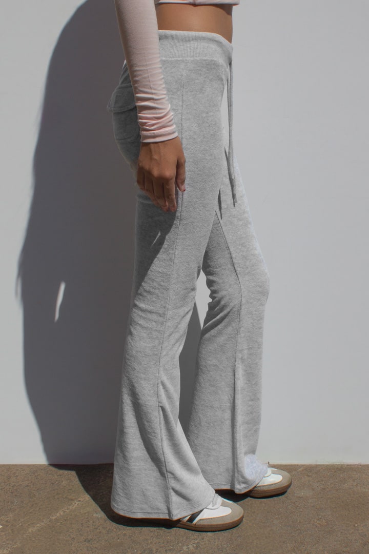Flared pants, back pockets, elastic waistband, regular length, slim fit.