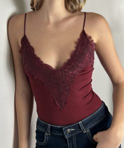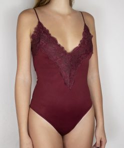 Lace bodysuit, deep V-neckline, sleeveless, lycra tactel fabric, snap button fastening, tight fit.