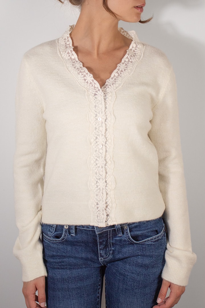 Lace cardigan, open front, long sleeves, regular length, relaxed fit.