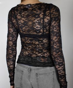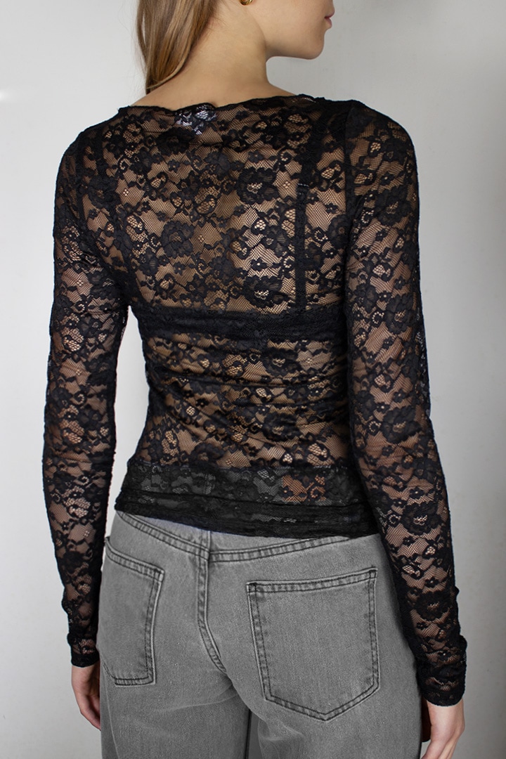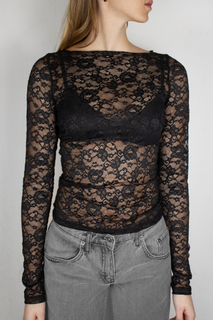 Lace T-shirt, boat neck, long sleeves, regular legth, slim fit.