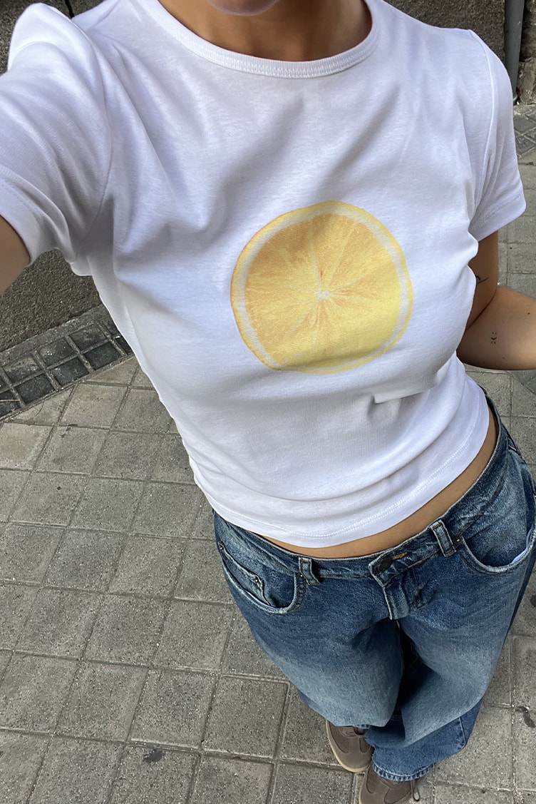 T-shirt with lemon print, crew neck, short sleeves, regular length, relaxed fit.