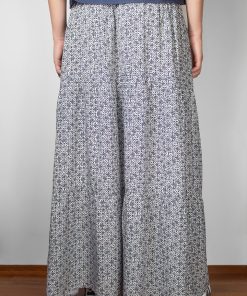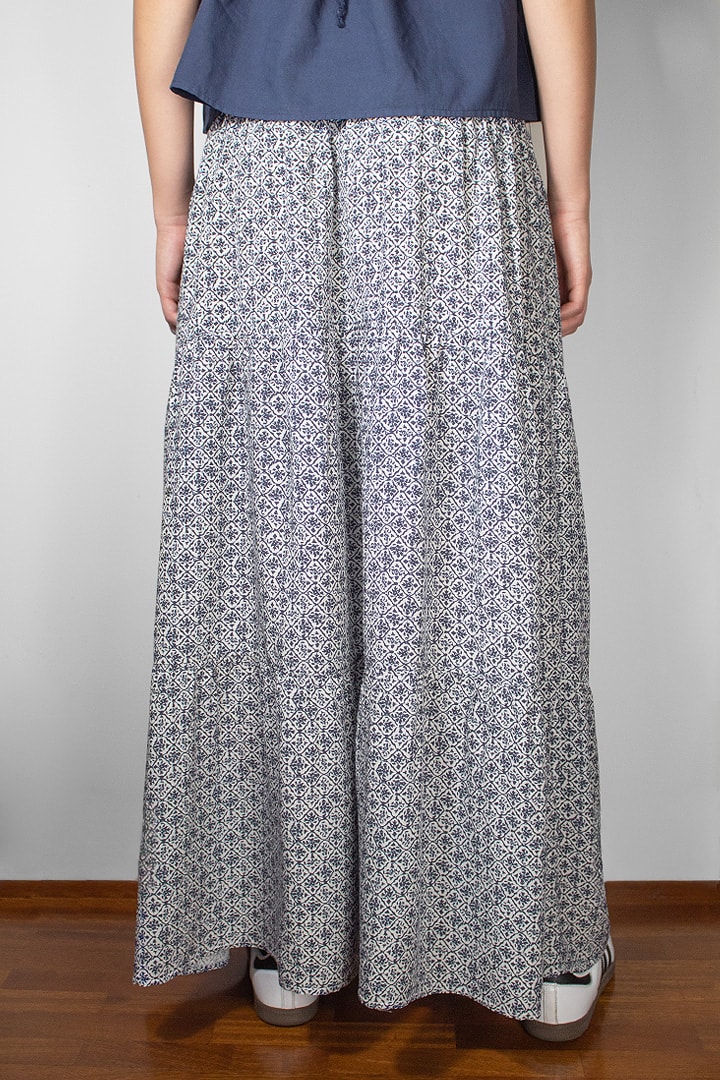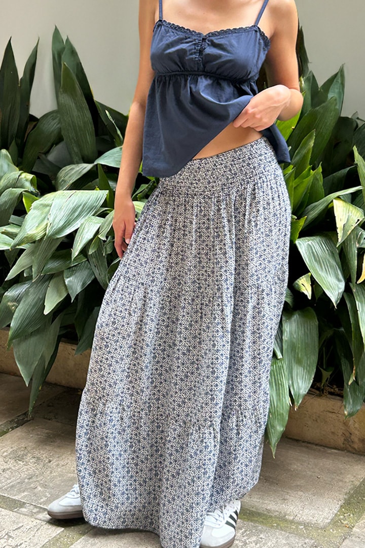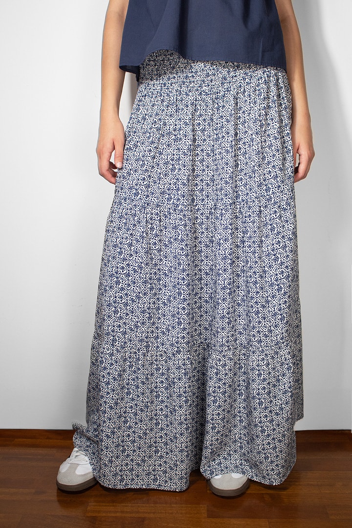 Long ruffle skirt, shirred waist, long length, relaxed fit.