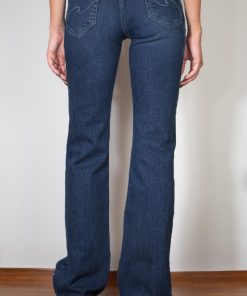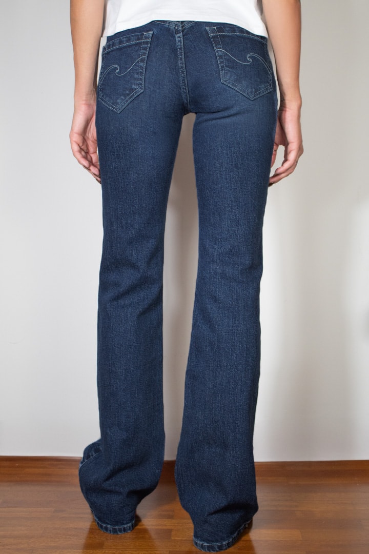 Flared pants, low waits, 4 pockets, belt loops, back pockets with embroidery, button up and zip fastening, regular length, slim fit.