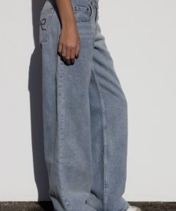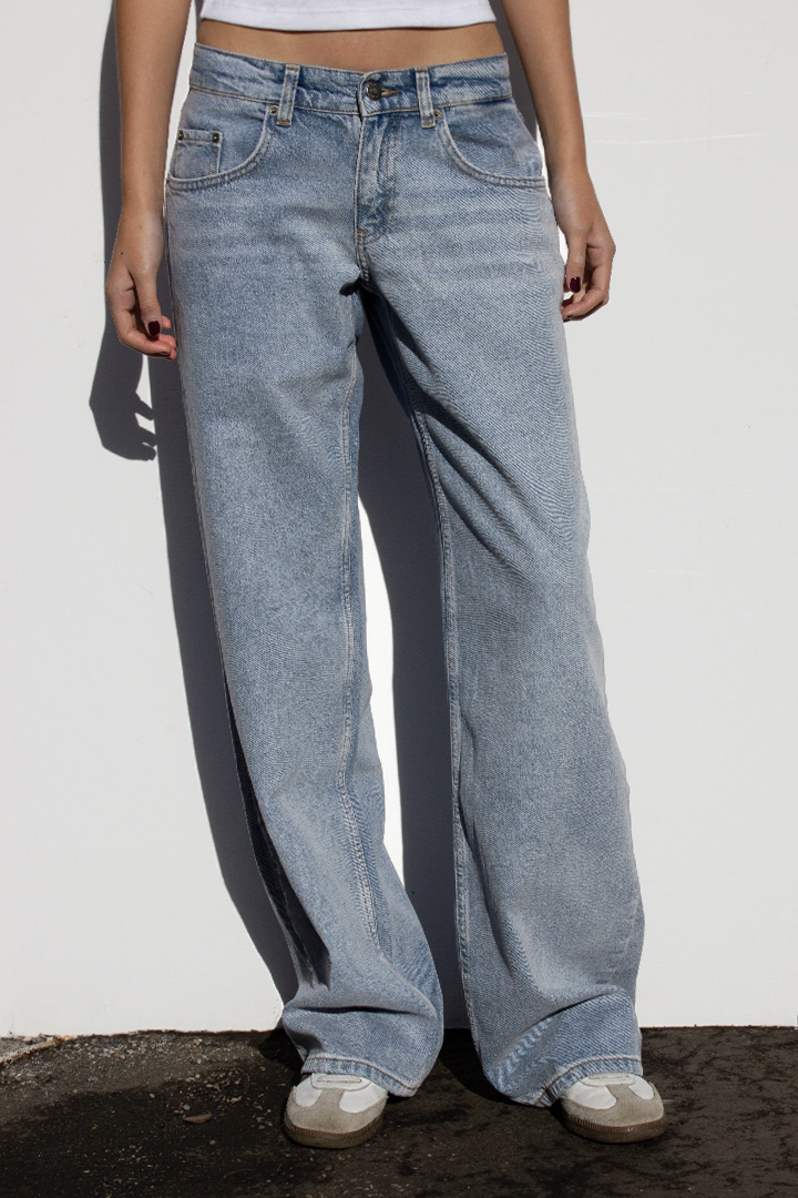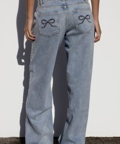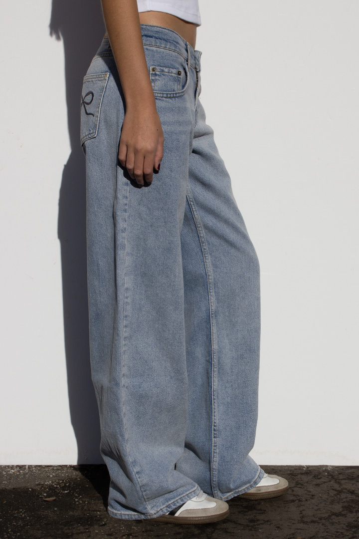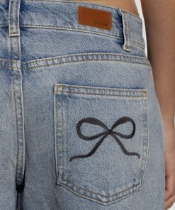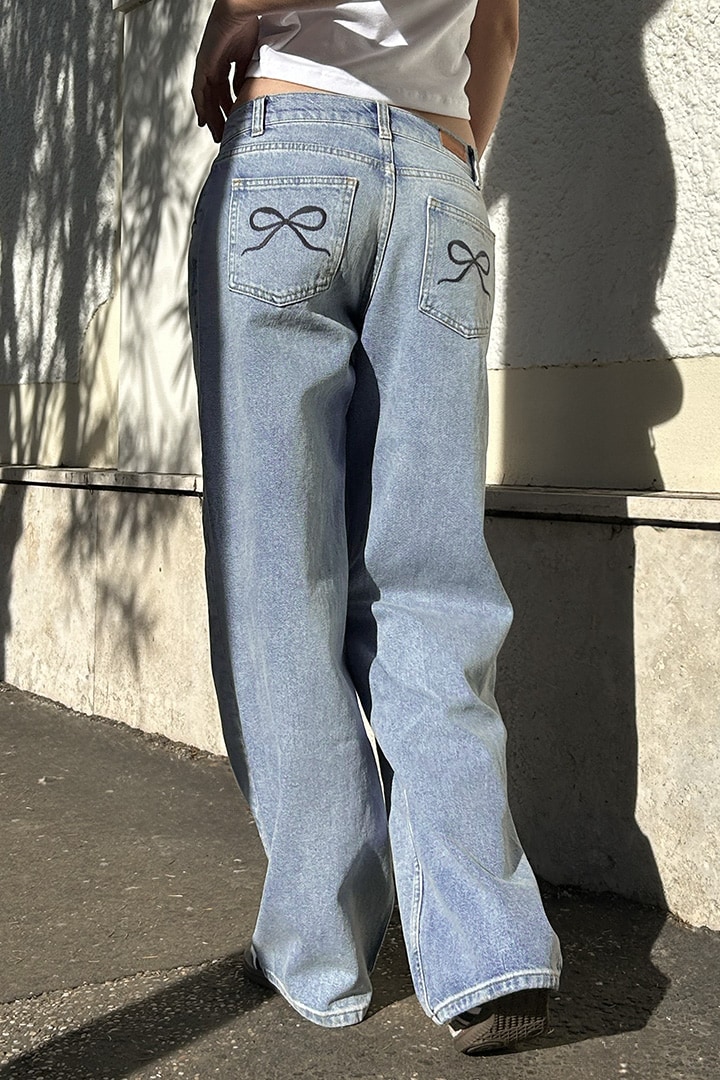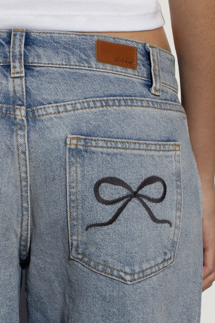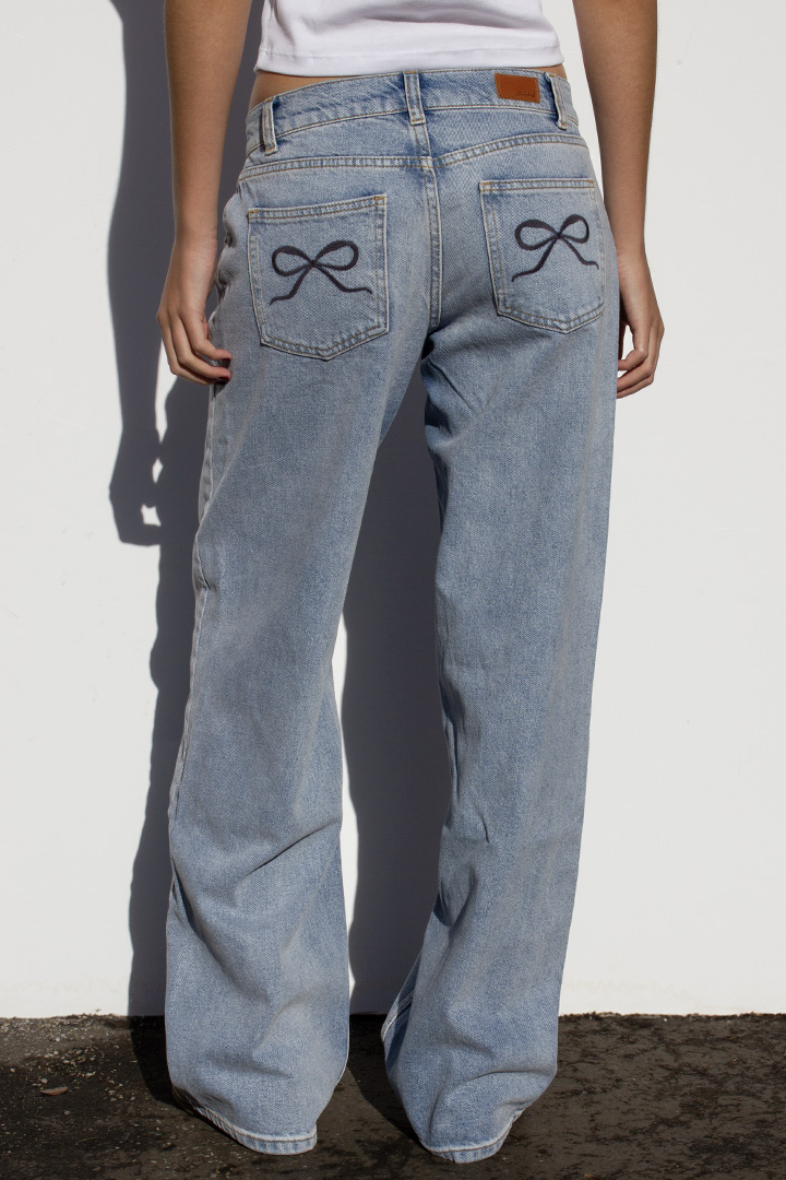 Jeans with bows embroidery, wide leg, low waist, button up and zip fastening, 4 pockets, belt loops in vita, relaxed fit.