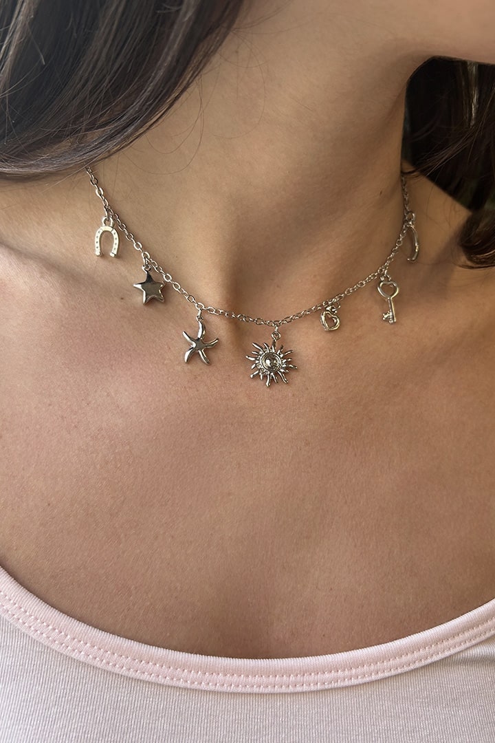 Multi pendant necklace, snap-hook fastening, adjustable length.