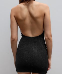 Dress with shawl collar, shimmering fabric, sleeveless, short length, tight fit.