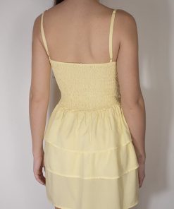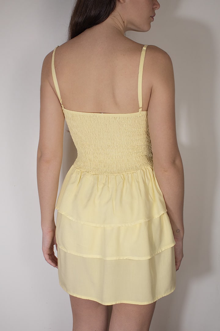 Shirred dress, V neckline, ruffle skirt, with adjustable shoulder straps, short length, tight fit.