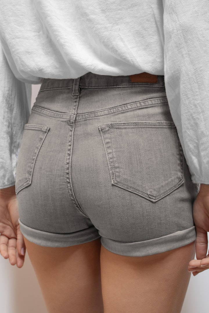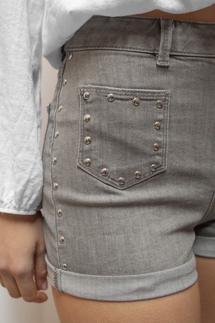 Shorts with pockets and studs, low waist, front pockets, belt loops, turn-up detail, short length, slim fit.