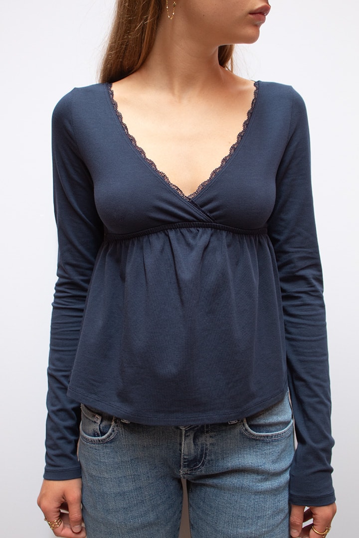 T-shirt with ruffle, v neckline, lace detail on the neckline, long sleeves, regular length, relaxed fit.