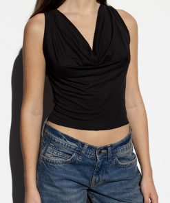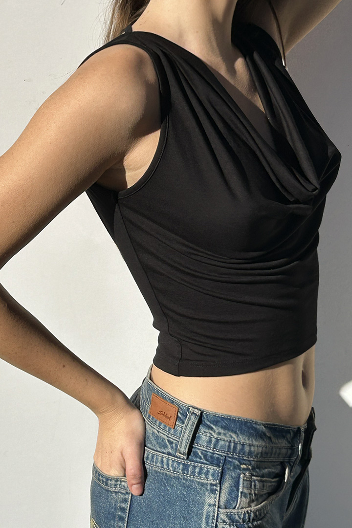 V-neck top, cowl neck, back tie fastening, short length, tight fit.